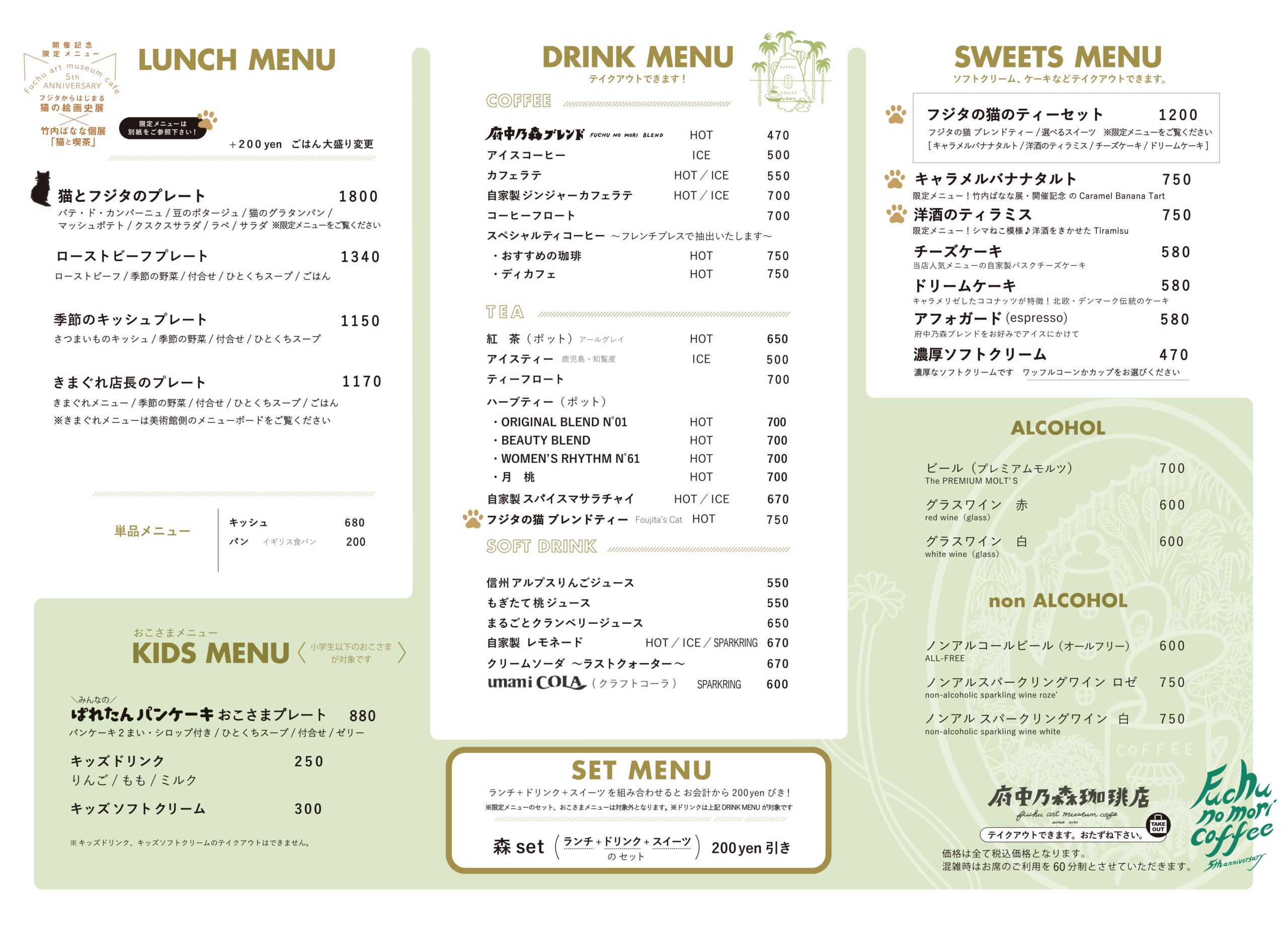府中市美術館併設喫茶室。テラス席はワンちゃんとのご利用可能です(衛生管理の観点から、お客様でのペットシートのご持参ご用意をお願い致します。)